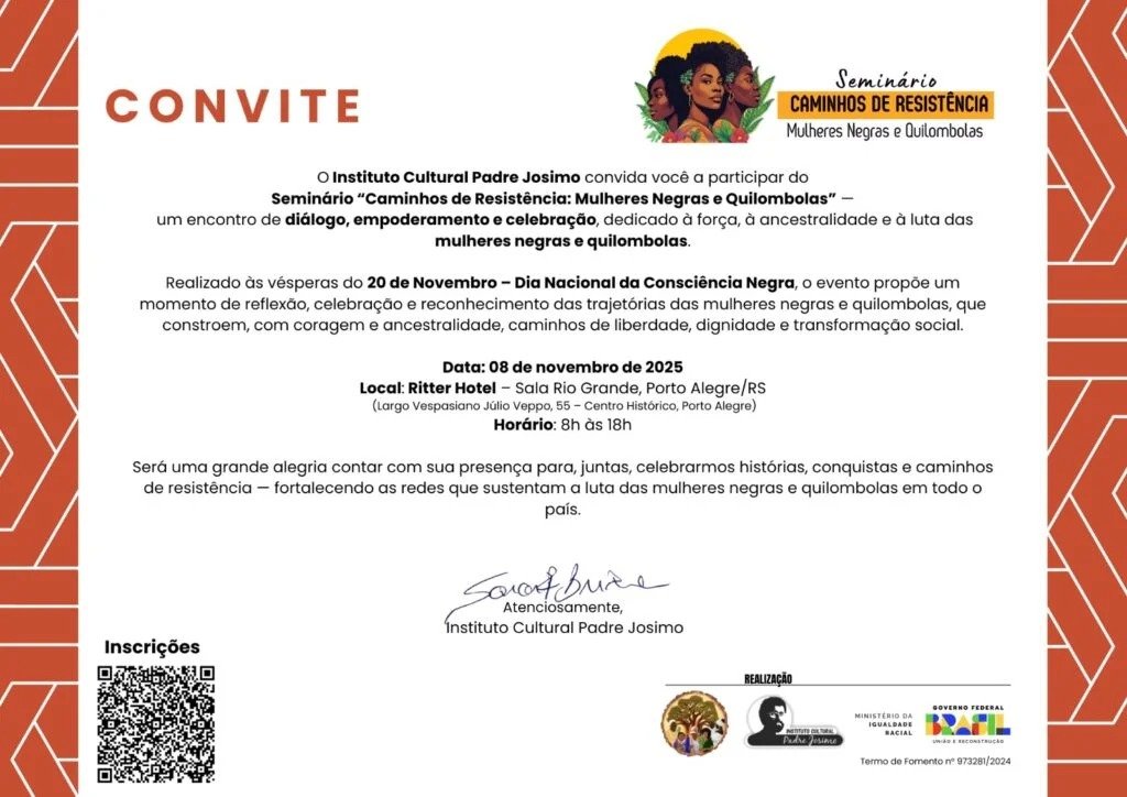Em referência ao 20 de Novembro — Dia da Consciência Negra, o seminário reforça a importância de manter viva a memória de Zumbi e Dandara dos Palmares e de todas as lideranças que abriram caminhos para que hoje possamos ocupar espaços de decisão e poder.
