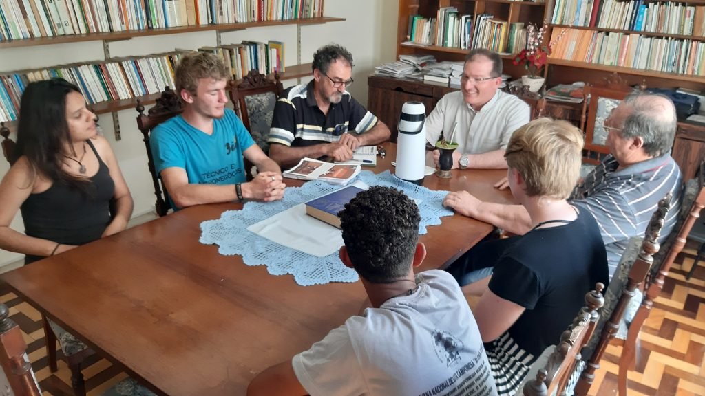 Foram cerca de duas horas de conversa, troca de ideias e identificação de objetivos comuns. No encontro entre o bispo de Bagé, Dom Frei Cleonir Paulo Dalbosco e os quatro jovens brigadistas do Movimento dos Pequenos Agricultores (MPA) que compõem a Caravana de Luta Camponesa Alexina Crespo, muitos assuntos foram postos em pauta, sempre a partir da necessária inserção do jovem nos processos de debate, intervenção e transformação social. “A igreja vivencia essa necessidade de trabalhar com a juventude, de colocar em prática o chamado do Papa Francisco para que essa capacidade de indignação contra as coisas que estão erradas e essa força natural que cada jovem tem para colocar-se em ação e buscar a transformação sejam elementos para a transformação da sociedade”, refletiu Dalbosco.
