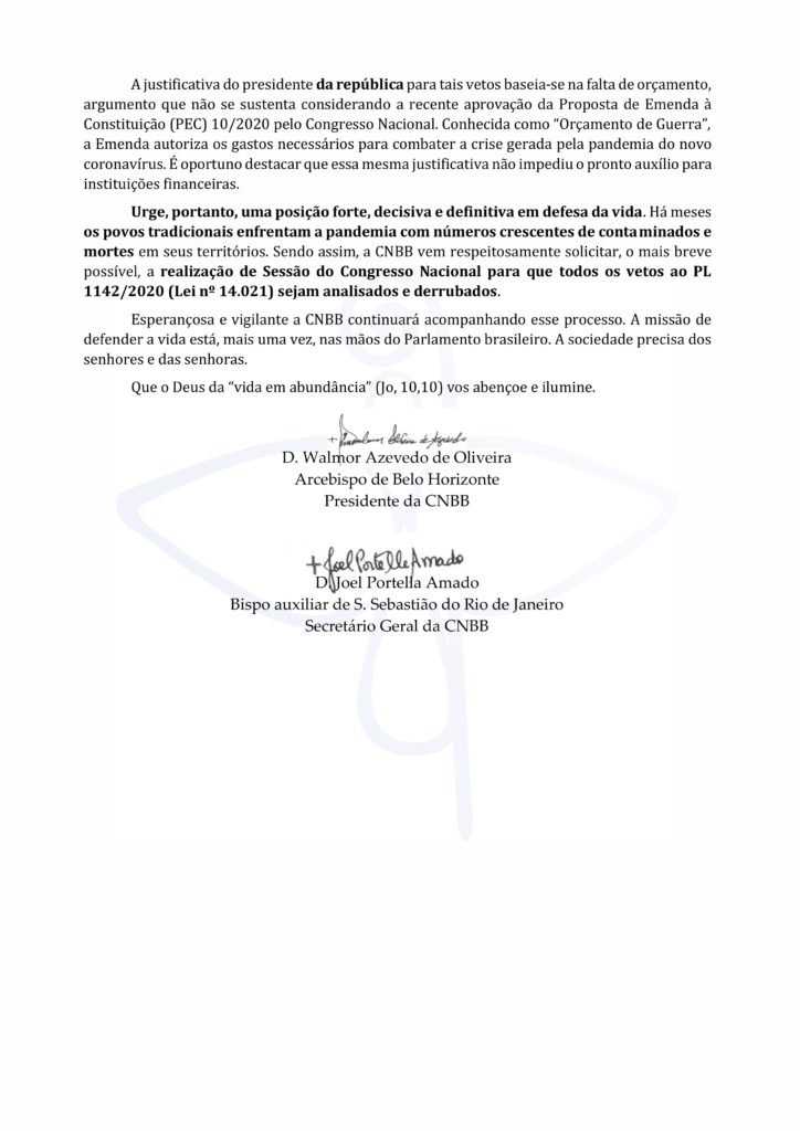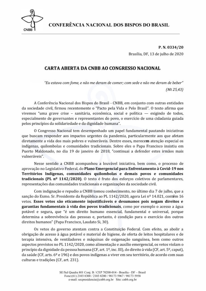 Na Carta, a entidade afirma ter sido louvável o processo de aprovação, no Legislativo Federal, do Plano Emergencial para Enfrentamento à Covid-19 nos Territórios Indígenas, comunidades quilombolas e demais povos e comunidades tradicionais (PL nº 1142/2020). Segundo a CNBB, o texto é fruto dos esforços coletivos de parlamentares, representações das comunidades tradicionais e organizações da sociedade civil.