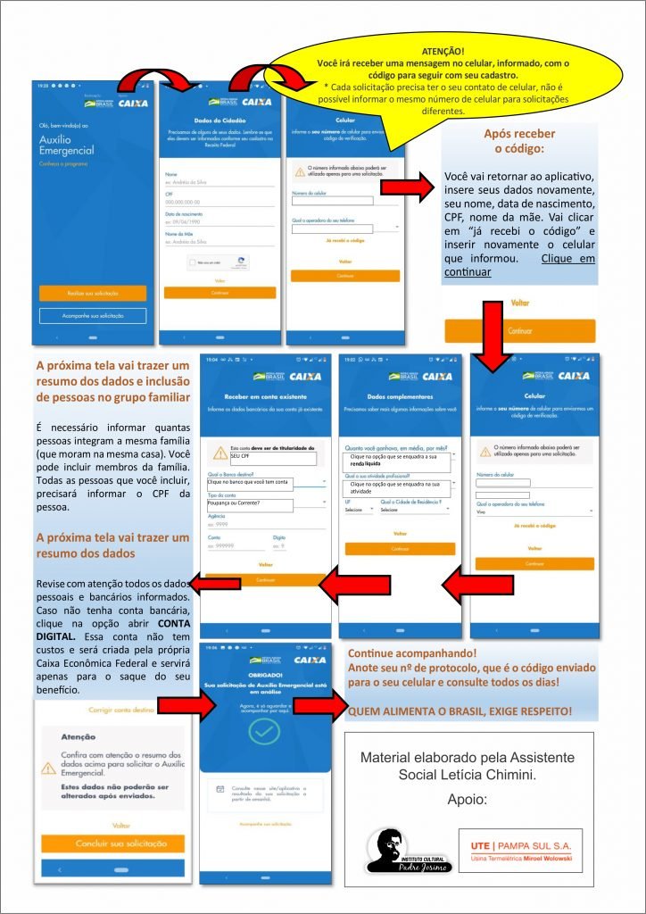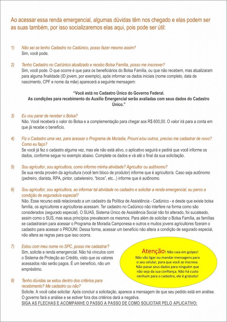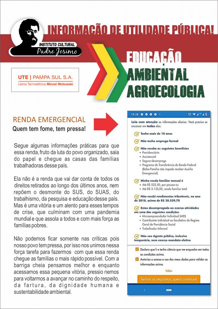 O ICPJ, em parceria com o projeto “Educação Ambiental e Agroecologia”, executado com a participação da Usina Termoelétrica Pampa Sul compartilha um guia de referência ao programa de Renda Básica Emergencial. A assistente social Letícia Chimini, que é ligada à base do Movimento dos Pequenos Agricultores (MPA) desenvolveu um pequeno guia de referência para tirar dúvidas e indicar o passo a passo para solicitação do benefício. Acesse as informações cliando nas imagens abaixo ou baixe o arquivo em PDF clicando AQUI!