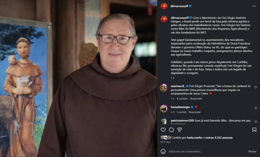 Estou muito triste com a partida de meu grande amigo, Frei Sérgio Antônio Görgen, que faleceu aos seus 70 anos. A fé e as sábias palavras de Frei Sérgio durante suas visitas em Curitiba me ajudaram a atravessar com força e esperança os momentos difíceis da prisão injusta a que fui submetido. Ele carregava consigo uma história de vida exemplar. De luta e de sacrifícios pessoais – incluindo greves de fome – para garantir os direitos daqueles que vivem da agricultura familiar. Frei Sérgio dedicou sua vida a cumprir o ensinamento de Cristo: “Dai de comer a quem tem fome”. Lutou pela alimentação do corpo e da alma. E deixa esta vida com sua missão cumprida, que seguirá servindo de exemplo e inspiração a todos nós. Descanse em paz, companheiro.